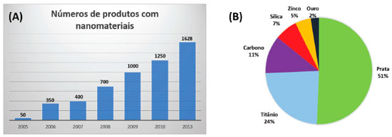 Em vista do numeroso uso das AgNPs (Figura 2), a Agência de Proteçao Ambiental dos EUA (EPA), recentemente, começou a exigir que os fabricantes de NPs de Ag registrem seus produtos, indicando que as nanopartículas podem trazer riscos diferentes do que a prata regular (nao nanométrica). Entretanto, existem alguns questionamentos a respeito deste ponto. Os clientes, por sua vez, muitas vezes nao podem verificar se os produtos contêm prata de tamanho nanométrico, já que nao há obrigaçao de se informar no rótulo do produto a presença de nanomaterais. A França foi um dos primeiros países a exigir este tipo de notificaçao nas bulas de cosméticos.5 A Figura 3A mostra o aumento do número de produtos comerciais com nanomateriais no período de 2005-2013, enquanto que a Figura 3B mostra a porcentagem de produtos associados a um específico material no ano de 2013.