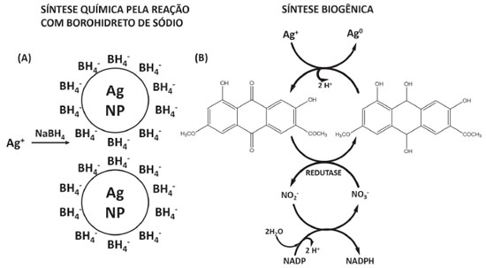 Figura 4. Síntese química (A) e biogênica de NPs de Ag (B) (modificado a partir das referências 22, com permissao da American Chemical Society, e 26, artigo de acesso livre distribuído sob os termos da Creative Commons Attribution License: http://creativecommons.org/licenses/by/2.0)
