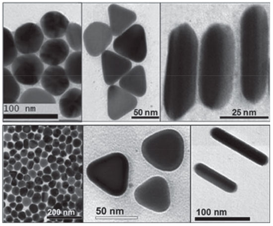 Figura 5. Imagens de microscopia eletrônica de transmissao de NPs de Ag nas formas esféricas, triangulares e de bastonetes, obtidas por diferentes protocolos sintéticos, (modificada a partir da referência 46, artigo de acesso livre distribuído sob os termos da Creative Commons Attribution 4.0 International License: http://creativecommons.org/licenses/by/4.0)