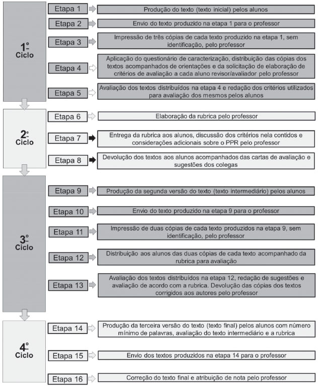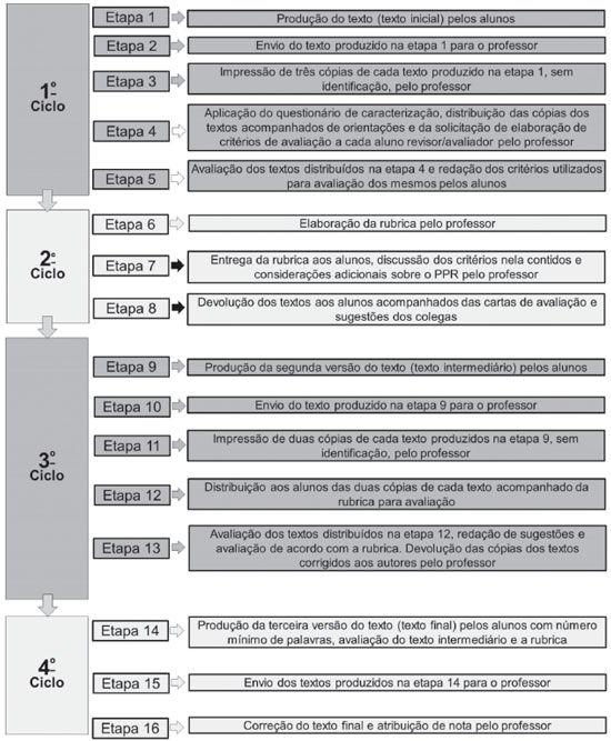 Tendo sido discutida a pertinência dos questionamentos apresentados por cada um dos grupos, os alunos foram incumbidos de escrever um texto sobre os problemas elencados e argumentar a favor de uma soluçao, que poderia ter sido, ou nao, mencionada pelos autores do artigo. Com os textos em questao em maos, o PPR foi entao desencadeado pelo professor. O processo ocorreu em quatro ciclos, divididos em dezesseis etapas. A Figura 1 demonstra esquematicamente os ciclos e etapas do PPR, de maneira a sintetizar parte do texto apresentado a seguir.
