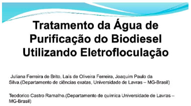 A partir dos dados dispostos na Tabela 4, neste trabalho iremos discutir detalhadamente os dados de G2, que apresentou maior número de slides. Uma vez que as demais EO apresentam algumas particularidades no que se refere à produçao do gênero, as características das EO de G1 e G3 serao contrapostas às da EO de G2. Dessa forma, a análise parcial de dois grupos, somada à análise detalhada de um deles tornará possível investigar a efetividade na elaboraçao da EO por parte dos estudantes, de acordo com as dimensoes ensináveis, assim como a tessitura de consideraçoes que podem ser valiosas aos professores no que diz respeito ao domínio e às fragilidades dos alunos em situaçoes de EO. O grupo G2 foi responsável pela leitura do artigo intitulado "Tratamento da água de purificaçao do biodiesel utilizando eletrofloculaçao".18 O AOP2 trata da necessidade de otimizaçao do processo de produçao de biodiesel, por conta do grande volume de água utilizado em suas etapas, que nao pode ser descartado no ambiente sem o procedimento adequado. O referido processo apresenta, além do biodiesel, a glicerina e o sabao como resíduos reaproveitados pela indústria. A partir disso, os autores propoem em seu trabalho a técnica de eletrofloculaçao como uma forma barata, eficiente e viável de método para a água de purificaçao do biodiesel, que possibilita a sua reutilizaçao no processo. Alternativas de tratamento sao citadas, como a purificaçao do biodiesel por meio do uso de adsorventes, que nao se mostrou uma técnica eficiente para o uso em escala industrial. O grupo G1 foi responsável pela leitura do artigo intitulado "Tratamento do efluente do biodiesel utilizando a eletrocoagulaçao/flotaçao: investigaçao dos parâmetros operacionais",19 que trata do processo de eletrocoagulaçao/flotaçao para o tratamento da água residual do processo de produçao do biodiesel utilizando eletrodos de alumínio. A partir de trabalhos reportados na literatura, alguns parâmetros operacionais foram testados pelos autores do AOP1, como um valor de pH inicial, a distância entre os eletrodos e o tempo de reaçao. Alternativas foram citadas, como o tratamento biológico, com o uso do ácido sulfúrico para recuperar o biodiesel do efluente. O grupo G3 foi responsável pela leitura do artigo intitulado "Utilizaçao de argilas para purificaçao de biodiesel",20 que trata da avaliaçao da eficácia da purificaçao de biodiesel metílico de óleo de soja descartado de processos de frituras, por meio das técnicas de lavagem com água destilada, adsorçao e destilaçao em bauxita, bentonita e atapulgita. Além disso, foi apresentada a comparaçao entre os métodos de purificaçao e foi verificada a remoçao do material insaponificável, contaminaçao total, glicerina livre e sabao. Os resultados demonstraram que a purificaçao a seco é uma alternativa possível para o biodiesel do ponto de vista econômico e ambiental, pois as argilas nacionais apresentam baixo custo e podem ser reutilizadas pelo processo de reativaçao. Estrutura da EO: suas partes e subpartes Segundo Dolz et al.,9 a exposiçao oral pode ser dividida em partes e subpartes, que organizam e permitem diferenciar as fases de sua organizaçao. Apresentamos a seguir a classificaçao e a discussao para os slides produzidos pelos grupos. Cabe destacar que algumas dessas partes nao estao necessariamente presentes no conteúdo dos slides, de modo que sao passíveis de observaçao somente a partir da transcriçao da fala do aluno expositor. A partir dessa classificaçao, discutiremos cada uma das partes dispostas na Tabela 4, destacando a produçao do G2, conforme mencionado. Abertura e introduçao ao tema Para Dolz et al.9 a abertura é caracterizada pelo cumprimento do aluno expositor aos espectadores e pela sua apresentaçao, que o coloca na posiçao de especialista em relaçao à temática que será apresentada. Ainda segundo os autores, esta é uma atividade bastante "ritualizada" e muitas vezes é entreposta por um mediador, em nosso caso, o professor responsável. O aluno expositor de G2 realizou essas etapas, conforme o slide 1, ilustrado na Figura 2.