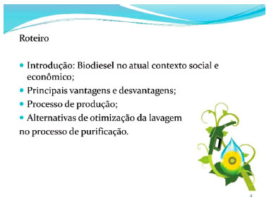 Um trecho da transcriçao para o referido slide auxilia na detecçao da abertura: Bom, primeiramente bom dia a todos. Eu gostaria de agradecer a professora doutora pela oportunidade da apresentaçao e também ao meu grupo (...), por todo o apoio, por toda força e pela ajuda. Dolz et al.9 tecem uma crítica em relaçao à pouca importância dada a esse momento em situaçoes de sala de aula, visto que, em muitos casos, o professor solicita para que o aluno vá para frente da sala e a EO se inicia, pulando esta etapa. Conforme o trecho da transcriçao acima, verificamos que isto nao ocorreu, de modo que o aluno expositor cumprimentou a todos, agradeceu ao professor pela oportunidade da apresentaçao e aos colegas de grupo. Esta atividade é relevante, pois define a situaçao de comunicaçao, os papeis e as finalidades da EO que será conduzida. Ainda que o professor e os demais integrantes do grupo G2 sejam conhecidos de todos os presentes, o fato de citá-los e agradecê-los atinge um dos requisitos da construçao do gênero EO. A introduçao ao tema é delimitada como o momento de introduçao no discurso, no qual há a apresentaçao e delimitaçao do tema. Assim, o aluno expositor pode justificar as suas escolhas, a sua motivaçao e o ponto de vista adotado para a apresentaçao da EO.9 Assim como o G2, os grupos G1 e G3 realizaram esta etapa, de modo que os alunos expositores apresentaram a si mesmos e o restante do grupo, cumprimentaram os colegas e agradeceram o professor, enquanto mediador da EO. A introduçao ao tema é realizada na sequência, conforme o trecho da transcriçao do grupo G2 abaixo, também referente ao slide 1: Hoje eu gostaria de falar um pouquinho mais sobre o tratamento da água de purificaçao do biodiesel utilizando a eletroflouculaçao. Por outro lado, o aluno expositor nao referenciou a autoria do AOP2, ainda que esta estivesse disposta no conteúdo do slide, de modo que os nomes dos autores do texto base nao fizeram parte da estrutura do gênero produzido. As particularidades da introduçao ao tema também nao foram evidenciadas em relaçao ao planejamento da exposiçao, de modo que as motivaçoes, as razoes para as escolhas do autor e a delimitaçao do tema nao foram explicitadas. Para Dolz et al.,9 esse é o momento de despertar a atençao e o interesse do público, porém, o aluno expositor nao realizou nenhuma explicaçao capaz de despertar tal interesse na abertura da EO. Nessa ocasiao, seria interessante que o aluno expositor compartilhasse alguma informaçao que julgasse interessante acerca do AOP2, visto que a sua leitura era obrigatória apenas para os integrantes do seu próprio grupo. No que se refere aos grupos G1 e G3, os alunos expositores citaram a temática que seria tratada, por meio do nome do AOP, assim como ocorrido no grupo G2. Além disso, o aluno expositor do grupo G1, de maneira distinta dos demais grupos, indicou os autores do AOP1 nos slides e comentou que os mesmos sao pesquisadores de uma universidade localizada no estado da Paraíba. Apresentaçao do plano Este momento é o de delimitaçao do assunto que será tratado na EO e se configura como uma etapa na qual se tornam evidentes, para o aluno expositor e para os espectadores, o planejamento,9 que inclui os objetivos e ideias que orientam a exposiçao.21 Assim, a etapa se mostra duplamente eficaz, esclarecendo o texto, enquanto produto do planejamento, e o planejamento em si.9 Dessa forma, o acompanhamento dos tópicos que foram abordados na EO e que auxiliam no entendimento do planejamento foram introduzidos no slide 2, além de uma imagem (Figura 3). Cabe destacar que as imagens utilizadas pelos estudantes nos slides expostos neste trabalho foram encontradas mediante a ferramenta online Google Imagens® ou pertenciam ao conteúdo do AOP (slides 14 e 16, discutidos posteriormente).
