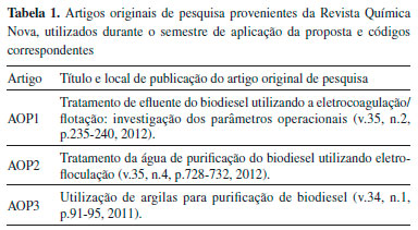 PERCURSO METODOLOGICO As atividades didáticas foram aplicadas a alunos matriculados na disciplina de Comunicaçao e Expressao em Linguagem Científica II (dois créditos teóricos, um crédito trabalho), na ocasiao oferecida no segundo semestre do curso de Bacharelado em Química do Instituto de Química de Sao Carlos (IQSC) da Universidade de Sao Paulo. A conveniência da aplicaçao da proposta na referida disciplina se deve ao fato do seu principal objetivo consistir no aprimoramento das capacidades de escrita, leitura e comunicaçao oral dos estudantes, e nao o ensino de conteúdos específicos de química. Essa busca ainda promover o aperfeiçoamento de assuntos correlatos estudados na disciplina de Comunicaçao e Expressao em Linguagem Científica I e fornecer aos alunos subsídios que lhes permitam a realizaçao de uma leitura crítica da literatura primária em química. Essa se caracteriza pela leitura das entrelinhas do texto, que ultrapassa a leitura das informaçoes dispostas e permite ao leitor interpretar e refletir sobre o seu conteúdo, produzindo inferências por meio da produçao de sentidos pautada na reuniao de informaçoes disponibilizadas e/ou da inserçao de novos conhecimentos.13 Tal peculiaridade favorece o emprego de práticas envolvendo a elaboraçao de EO. As atividades de produçao de EO estiveram vinculadas à aplicaçao de um processo de peer review (doravante PPR), assim como utilizado pela comunidade científica para a avaliaçao dos trabalhos redigidos por pesquisadores engajados na mesma área de conhecimento. O PPR, quando empregado como uma estratégia didática, tem finalidades distintas, como a promoçao do entendimento sobre a importância da produçao escrita na comunidade científica e o desenvolvimento da habilidade de leitura crítica, além do aprofundamento no entendimento de conceitos.14 O propósito principal da aplicaçao do PPR na disciplina foi o de entendimento dos conteúdos expressos nos AOP por parte dos estudantes, o que seria agente causador de impacto nas EO. No semestre de aplicaçao da proposta, os sujeitos foram os estudantes que participaram de todas as etapas que serao descritas a seguir e autorizaram a utilizaçao das informaçoes coletadas por meio da assinatura de um Termo de Consentimento Livre e Esclarecido, onde constam as normas éticas da pesquisa e seus objetivos. Assim, analisamos os resultados obtidos por 12 alunos, que elaboraram EO a partir de AOP sobre técnicas relacionadas à purificaçao no processo de produçao de biodiesel. Para a realizaçao das atividades, os alunos efetuaram leitura crítica orientada pelo professor dos artigos apresentados na Tabela 1, extraídos desta Revista e selecionados por ele previamente. Cada grupo de alunos fez a leitura de um AOP.