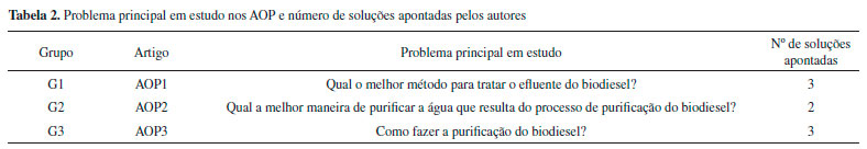 Todos os artigos tratam da temática biodiesel e foram escolhidos por abordarem apenas técnicas analíticas de fácil compreensao. A delimitaçao da escolha dos artigos com base neste último critério foi devido ao fato dos alunos, ainda no segundo semestre do curso, nao possuírem conhecimentos acerca de determinados princípios de química, imprescindíveis para o entendimento de técnicas analíticas mais sofisticadas. Cabe destacar ainda que mais dois critérios foram levados em conta na escolha dos artigos, com base nas consideraçoes de Santos e Queiroz.15 Os autores sugerem que existe a preferência dos alunos pela leitura de artigos originais de pesquisa que "nao sao demasiadamente extensos e que privilegiam a reflexao e a discussao sobre aspectos nao apenas científicos, mas também tecnológicos e sociais" (p. 193). As atividades na disciplina foram realizadas individualmente e em grupo. Foram formados três grupos (doravante G1, G2 e G3), compostos por quatro alunos cada, cujas EO foram selecionadas para análise neste trabalho. No primeiro dia de aula, o professor informou sobre o conteúdo a ser ministrado na disciplina, seus principais objetivos e procedimentos. Nas semanas seguintes, individualmente, cada aluno concluiu três atividades que consistiam na resoluçao de questoes concernentes ao artigo estudado. Nesse ínterim, foi também ministrada aula expositiva na qual o professor fez consideraçoes sobre a preparaçao e apresentaçao de trabalhos orais e de painéis. Essas consideraçoes foram tecidas no sentido de apresentar aos alunos a organizaçao interna inerente às EO, na perspectiva descrita no tópico anterior: Dimensoes Ensináveis do Gênero Exposiçao Oral. Na semana seguinte à aula expositiva foi iniciado o PPR, que ocorreu parcialmente em horário extraclasse e concomitantemente à realizaçao das seguintes atividades relacionadas ao AOP: EO das seçoes "Introduçao" e "Parte Experimental" (com ênfase nas técnicas empregadas), EO do artigo completo, apresentaçao oral de painel sobre o artigo e reapresentaçao oral do artigo. Em cada uma das quatro ocasioes, o grupo foi representado por um integrante. As apresentaçoes foram feitas em PowerPoint e tiveram a duraçao de dez ou vinte minutos, dependendo da sua natureza. Após as apresentaçoes orais do artigo completo, os alunos tiveram dez minutos para formular perguntas aos alunos expositores, representantes de cada um dos grupos, e estes tiveram, aproximadamente, o mesmo período de tempo para respondê-las, contando com o auxílio dos demais membros do seu grupo. Cabe destacar que neste trabalho sao analisadas as EO sobre o artigo completo. É ainda muito importante reforçar o papel fundamental que o PPR desempenhou na elaboraçao das EO, uma vez que o seu desencadeamento forneceu elementos para que a leitura dos AOP fosse realizada de forma crítica e criteriosa. Por essa razao, o PPR encontra-se detalhadamente descrito a seguir. Preparaçao, aplicaçao e avaliaçao do PPR Antes do desencadeamento do PPR na disciplina de comunicaçao científica, os alunos participaram de uma aula que foi idealizada com o intuito de prepará-los para a produçao de um texto argumentativo, que seria o produto a ser avaliado no processo. Esse deveria ser redigido com base em informaçoes contidas no artigo estudado pelo grupo. Nessa perspectiva, o professor fez uma breve exposiçao sobre as características inerentes a um texto argumentativo e, em seguida, propôs aos alunos que participassem de um jogo argumentativo.16 Para tanto, cada um dos seis grupos elaborou, em um intervalo de vinte minutos, um bom argumento sobre o porquê do seu merecimento a uma caixa de chocolates. Os alunos foram informados que as razoes para o merecimento do prêmio poderiam ser reais ou imaginárias, formais ou informais, direcionadas para um membro da equipe ou à equipe inteira. O professor até entao nao exerceu nenhuma influência sobre os argumentos dos alunos. Concluída a elaboraçao do argumento, este foi apresentado oralmente por um integrante de cada grupo. Após as apresentaçoes dos grupos, um material com definiçoes e exemplos de componentes do argumento, segundo Toulmin,17 foi entregue a cada um deles. Com o apoio desse material, os alunos tentaram identificar a existência dos componentes nos argumentos por eles elaborados para justificar o merecimento do grupo ao prêmio. Ou seja, os alunos tentaram identificar tais componentes em seus próprios argumentos, que foram também analisados pelo professor, o que permitiu o alcance de um consenso sobre o grupo vencedor. Concluído o jogo, o professor esclareceu aos alunos que os conhecimentos adquiridos na aula sobre a estrutura de um "bom argumento" deveriam ser usados na produçao de um texto argumentativo individual sobre a temática em foco no artigo em estudo. Dessa forma, solicitou que cada grupo escrevesse no quadro negro, no formato de questionamento, o problema principal tratado no artigo, assim como a quantidade de soluçoes indicadas pelos autores. A Tabela 2 ilustra o problema principal em estudo em cada um dos artigos e o número de soluçoes apontadas para cada um deles, segundo o entendimento dos grupos.