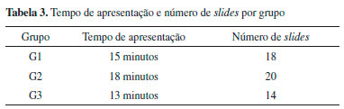 RESULTADOS E DISCUSSAO Nesta seçao, apresentamos a análise do conjunto de slides elaborados pelos integrantes dos grupos. O tempo de apresentaçao de cada grupo, bem como o número de slides produzidos por cada um deles está apresentado a seguir (Tabela 3):