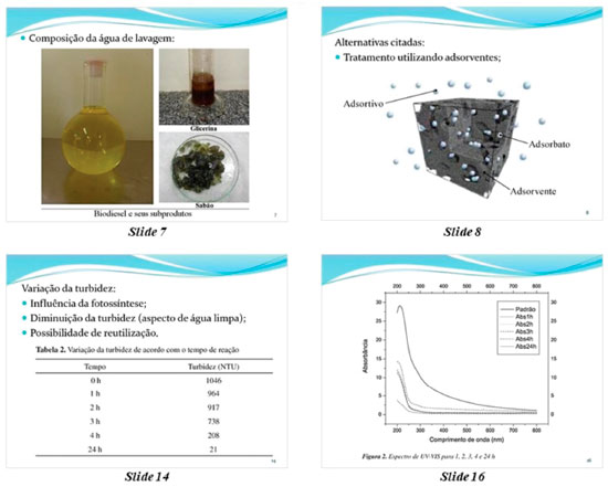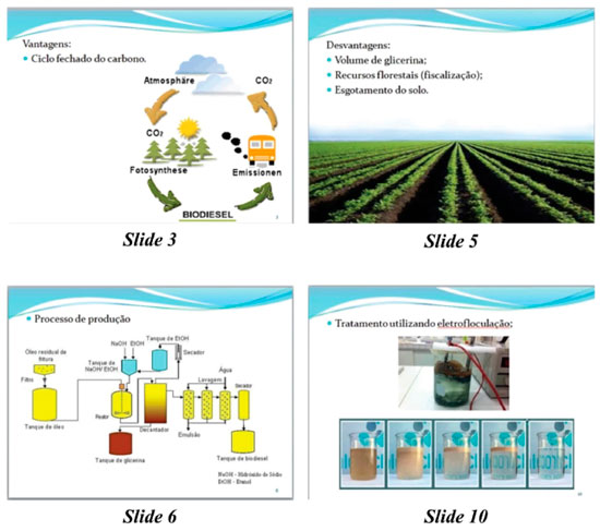 Um trecho da transcriçao da EO do grupo G2 demonstra o plano de exposiçao: Entao, primeiramente eu vou dar uma rápida introduçao sobre o biodiesel no atual contexto. É, vou falar as principais, as que mais se destacam, as principais vantagens e desvantagens. Vou apresentar o processo de produçao e a questao problema do processo de produçao e aí eu vou explanar um pouquinho mais sobre as alternativas de reutilizaçao da lavagem especificamente. A partir do trecho transcrito, observamos que o aluno expositor enumera os tópicos que serao apresentados por ele durante a EO. Para Silva21 os organizadores temporais (primeiro, segundo, depois etc.) possibilitam perceber quais os temas serao tratados e auxiliam na compreensao do público acerca da sequência textual da EO. Dessa forma, a apresentaçao do plano da exposiçao sugere o domínio, ainda que parcial, da estrutura do gênero elaborado. O aluno expositor destacou a inserçao de uma breve introduçao sobre a temática em questao, depois a apresentaçao de suas vantagens e desvantagens, seguida da apresentaçao do processo de obtençao do biodiesel. Tais tópicos foram inseridos por ele, a fim de potencializar o entendimento dos espectadores. Houve a inserçao de informaçoes ao conteúdo do AOP2, mesclando o que seria apresentado aos espectadores, de modo que a contextualizaçao do tema marca o modo de organizaçao da EO, que oferece uma visao amplificada do assunto, para depois entrar no tema específico da purificaçao da água de lavagem do biodiesel. Tal comportamento demonstra o envolvimento do aluno expositor com o tema. Cabe destacar que a elaboraçao de um plano de exposiçao foi recomendada pelo professor na aula de preparaçao sobre o gênero EO, de acordo com o livro texto adotado na disciplina.22 Os autores destacam que "pode ser apresentado um esboço ou resumo do que será exposto, para que as pessoas possam tomar conhecimento do assunto a ser abordado" (p. 41). Silva21 salienta a importância do plano de exposiçao para os espectadores, de modo que eles possam ter a compreensao das partes que serao abordadas. De fato, em muitas ocasioes esses nao têm conhecimento detalhado acerca do tema que será exposto, assim, tal organizaçao pode favorecer o entendimento acerca do desenvolvimento das ideias que serao apresentadas na sequência. Em relaçao aos demais grupos, ambos cumpriram a etapa de apresentaçao do plano, porém, de formas distintas. O aluno expositor de G1 realizou a apresentaçao do plano de acordo com o seu entendimento sobre o AOP. Assim como ocorrido para o grupo G2, nao foram utilizadas as mesmas seçoes contidas no texto base, mas sim títulos elaborados pelo grupo. Por outro lado, o aluno expositor de G3 apresentou o plano seguindo exatamente as mesmas seçoes do AOP (Introduçao, Parte Experimental, Resultados e Discussao e Conclusao). Desenvolvimento e desencadeamento dos diferentes temas Segundo Dolz et al.,9 o desenvolvimento e o desencadeamento dos diferentes temas devem seguir a numeraçao disposta no plano de exposiçao. Destacamos que no slide 2, referente ao plano, nao foram utilizados números que indicassem os tópicos a serem expostos. Por outro lado, o aluno expositor organizou suas ideias na mesma ordem de tópicos, conforme os slides 3 (vantagens), 5 (desvantagens), 6 (processo de produçao) e 10 (tratamento utilizando eletrofloculaçao), conforme ilustra a Figura 4.