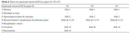 Verificamos que o grupo G2 produziu maior número de slides e apresentou a EO em maior tempo, seguido por G1 e G3. No que se refere às Dimensoes Ensináveis do Gênero Exposiçao Oral, nos atentaremos à organizaçao interna de cada EO e, a partir disso, realizamos comentários acerca das características linguísticas, conforme mencionado anteriormente. Em síntese, verificamos que as partes da EO propostas por Dolz et al.9 foram evidenciadas em sua maioria. Assim, a Tabela 4 ilustra de forma sintética como se deu a organizaçao interna da EO de cada um dos grupos.