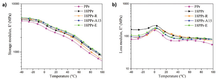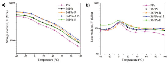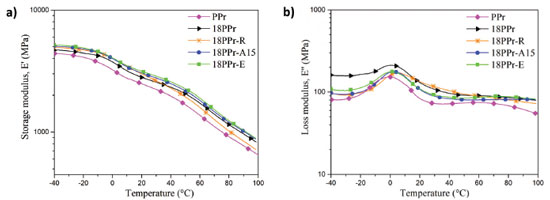 For the specific composites, in Figure 1a) it can be noticed that the separation in E' trajectory is minimal for the different composites containing 18 wt % of AF, especially in the low temperature region, and up to 20 ºC. At that temperature, 18PPr-E and 18PPr-A15 materials present the higher E' values and they maintain their position up to 100 ºC. The small difference in E' values can be seen in Table 3, denoting that there is only a 6.1% difference between the highest (18PPr-E) and lowest (18PPr-R) E' value of the coupled composites at 20 ºC with respect to PPr, although the increments in E' value are 27.7 and 21.6%, respectively. The small difference in values may be due to the small AF content in the materials. However, for composites with 36 wt % of AF (Figure 2a)), such type of difference increases to 29% (between 36 PPr-A15 and 36PPr-E materials), and the equivalent increments in E' correspond to 45.2 and 16.5% respectively. Both types of coupling agents (the commercial one and the rosin coupling agents) show a positive effect with the low content of fiber, while for the composites with high content, only the rosin agents offered positive results, exhibiting the higher values of E' for the entire temperature range studied (Figure 2a)). Furthermore, looking at Table 3, it is important to notice that both of the rosin coupling agents produce an increase in E' (at 20 ºC) as the fiber content increases, while for the commercial agent (Epolene E-43) the effect was negative when the fiber content was increased, denoting less interaction between the polymer and the fiber with such agent if a high fiber concentration is used.