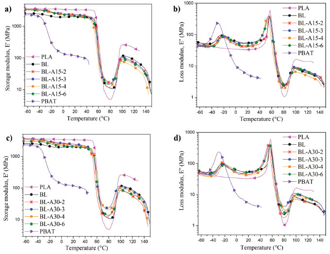 Figure 3. Temperature dependence of PLA, PBAT and 80/20 w/w PLA/PBAT blends, with/without compatibilizer for: a) and c) Storage modulus; b) and d) Loss modulus at 1 Hz frequency