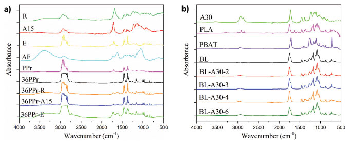 Figure 4. ATR-FTIR of: a) PPr, AF, R, A15, E and PPr/AF composites with 36 wt % AF varying CA type; b) PLA, PBAT, A30 and their blends, varying A30 concentration