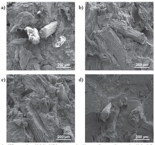 ![]() Figure 5. SEM photographs of PPr composites with 36% of AF for: a) composite without coupling agent; b) composite with 3wt % R as CA; c) composite with 3wt % of A15 as CA; d) composite with 3wt % of E as CA