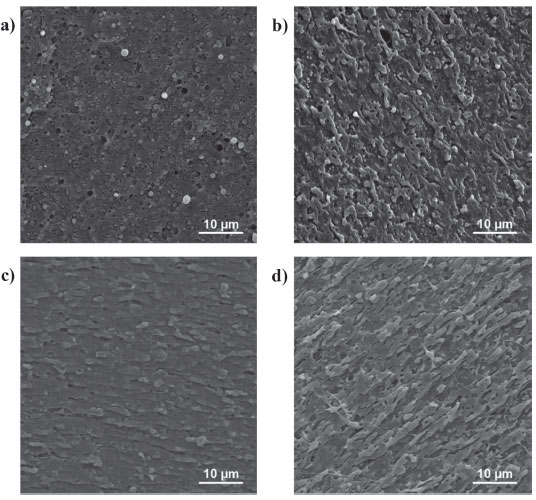 ![]() Figure 6. SEM photographs of 80/20 w/w PLA/PBAT blends for: a) blend without compatibilizer; b) blend with 2wt % of A30; c) blend with 3 wt % of A30; d) blend with 4 wt % of A30