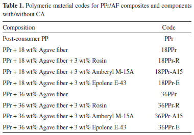 MATERIALS AND METHODS Materials Composites. Post-consumer polypropylene from Ecopolímeros (MEXICO) with a density of 0.87 g cm-3 and melt flow index of 1.26 g/10 min was used as polymer matrix. Agave fiber (AF), (A. tequilana Weber var. Azul), which is a discarded fiber from tequila factories, with 210 µm average diameter (washed, dried and milled to 65 mesh without further preparation) was used as reinforcing agent. Pine gum (from the forest industry of Jalisco, MEXICO (with acidity number 145 - 155 mg KOH g-1) was used as coupling agent (R), as a source from natural origin; pine maleated resin (Amberyl M-15A (A15)) provided by Polímeros Sintéticos S.A (MEXICO) with acidity number 15 - 26 mg KOH g-1 was used as CA, maleated polyethylene (Epolene E-43 (E)) provided by Eastman Chemical Corp. (USA) with acidity number of 40 - 55 mg KOH g-1 was also used as CA. Polymer blends. PLA grade 2003D (from Nature works LLC, USA), and PBAT (ECOFLEX F blend C1200, from BASF), were used as acquired to prepare the polymer blends. A15 and Amberyl MP-30 (A30), acidity number 15 - 25 mg KOH g-1 (both provided by Polímeros Sintéticos S.A. (MEXICO)), were used as compatibilizing agents. Preparation, processing and testing of samples Composites. PPr composites with AF were obtained by a two stage process in a twin screw extruder (Leistritz Micro 27 GL/GG 32D) doing AF feeding with a side feeder. The extruder has an L/D = 36 (screw diameter = 27 mm). Mixing was done in a corrotative mode (temperature range: 165 -190 ºC). For the first stage, PPr and one CA were extruded to attain a fine CA dispersion. The product was granulated and re-extruded, while adding along the AF (previously dried in a convection oven at 65 ºC for 48 h). Composite plates (3 mm of thickness) were prepared in a Carver press at 180 ºC and 49 kN of closing force. Compatibilized polymer blends: First, PLA and PBAT were dried at 60 ºC for 48 h. Blends of PLA/PBAT (80/20 w/w) (I), were prepared in the aforementioned twin screw extruder at 160 - 180 ºC, after premixing each blend in manual form with the respective compatibilizer (using 2, 3, 4 or 6 wt % of A15 or A30 with respect to the polymer blend weight, in powder form). The extruded materials were dried in an oven at 60 ºC for 48 h to prepare samples for mechanical tests by injection molding (NISSEI model ES-1000), at 190 ºC. Dynamic-mechanical tests: Dynamic properties of both types of multicomponent polymers as a function of temperature were followed using a dynamic mechanical analyzer of TA Instruments (Model Q800) following ASTM D-5023-01 at a frequency of 1 Hz. For the composites, the temperature test range used was from -40 to 100 ºC, and for the polymer blends from -65 to 150 ºC. Static-mechanical testing: For the composites and blends, the stress-strain (ASTM D 638-03 using IV-b type specimens), and flexural tests (ASTM D-790-03), were performed in an Instron Universal Testing Machine (model 4411) at 25 ºC, using a crosshead speed of 5 and 1 mm min-1 respectively (using 50 mm between bars for the flexural tests). Attenuated total reflection Fourier transform infrared spectroscopy (ATR-FTIR): Spectra of the polymeric samples were obtained using a Thermo Scientific, Nicolet iS50. The infrared spectra were recorded at a resolution of 4 cm-1 from 4000 to 500 cm-1. Scanning electron microscopy (SEM): For this characterization, the polymeric materials with and without CA/compatibilizer were cryogenically fractured in liquid nitrogen before they were gold coated using a vacuum sputter, to observe them (across the thickness) in a TESCAN equipment (model MIRA 3LMU). Blends Biodegradation: For this test, the IS/ISO20200:2004 norm was applied, using 25x25x2.5 mm3 samples to do composting in a convection oven for 90 days. Samples Code For the discussion in the next section, a code is presented in Tables 1 and 2 for all the polymeric materials used in this work.