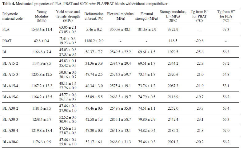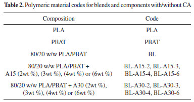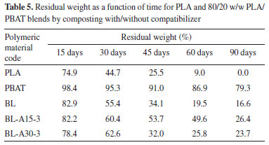 Biodegradation For biodegradable behavior (Table 5), the weight loss results as a function of time are positive for the tested materials. For the 90day period of the experimental test, the values obtained for PLA and the different blends present certain variation, achieving the highest degradation rate for PLA and the lowest for PBAT; nevertheless, reasonable biodegradation values were obtained for the blends that included compatibilizer, indicating that the help that it can afford to improve mechanical performance, does not affect its biodegradation capability. Furthermore, extrapolating the data of Table 5 for the blends residual weight to 0%, the time values are 107 and 128 days for the blends with A30 and A15 respectively. Such values are shorter than the one indicated by the European standard for biodegradability of materials (180 days), using composting.41 The biodegradation capability of blends is becoming an important issue for specific applications, and the maleinization or similar modifications of natural gums (like pine rosin) may be used to increase chemical component interactions.