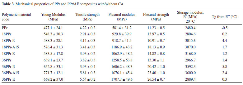 RESULTS AND DISCUSSION Dynamic Mechanical Analysis (DMA) DMA results for the composite formulations of PPr reinforced with 18 or 36 wt % of AF, containing 3 wt % of the respective CA, are shown in Figures 1 and 2. There, the composites' response as a function of temperature can be observed to compare the effect of the coupling agents used on such properties. For storage modulus (E'), all composite materials follow similar behavior as temperature increases up to 100 ºC.