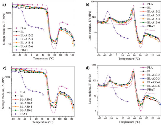 For loss modulus (E"), an almost constant value in the low temperature region (Figures 1b) and 2b)) that coincides with the equivalent E' behavior is followed by a peak which represents the PP glass transition temperature of the materials (Table 3); the temperature of such peak corresponds to the small decrease in E'at approximately 0 ºC (Figure 1a)). For the composites, the PP Tg displacement from -19 ºC23 to higher value, is caused by the fiber presence; that behavior has been typically reported with different kinds of reinforcing agents. Additionally, small variations in the peak temperature among the composites can be noticed in Figures 1b) and 2b) for samples containing the same amount of AF; those variations appear due to the inclusion of the different CAs used. Such phenomenon is related to the role of a CA, which acts as a link between the polymer and the fiber. The generated forces of attraction promote a retardation of segmental movement within amorphous molecules of the polymer. Such interaction is reflected in the higher E' values obtained with the composites containing rosin, compared to those containing the commercial CA, being the maleated rosin CA the one which provides the highest reinforcement. For the PLA/PBAT blends, the dynamic-mechanical results for the 80/20 w/w samples are shown below in Figure 3, varying the concentration of the used rosin compatibilizers. For the E' plots (Figures 3a), and 3c)), all blend materials lie in between the trajectories of the pure components (PLA and PBAT); for the blends, the decrease in modulus caused by the PBAT presence is extended by a decrement in the vicinity of its Tg, which appears between -24 and -20 ºC depending on the wt % of the compatibilizer used. Then, the E'value of the blends remains almost constant, until the Tg of PLA is approached. Finally, the PLA crystallization in cold24 can be noticed in the PLA sample, and all the blend materials, at approximately 100ºC. The positive effect of the maleated rosin compatibilizers on storage modulus of the blends (varying compatibilizer concentration), can be observed in both formulations, showing the A30 compatibilizer the higher effect comparing with the blend without compatibilizer. Looking at Table 4 for the E' values, it can be noticed that the highest increment for the A30 agent, is obtained with 3 wt % of compatibilizer. Such effect which relies on intermolecular forces of attraction, is temperature dependent, and the attained increments in E' decrease after the glass transition temperature is reached.