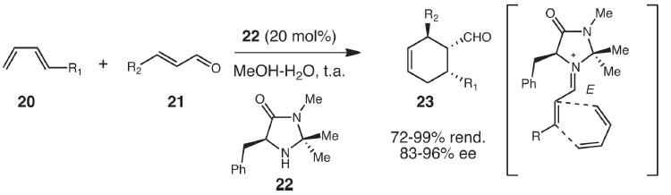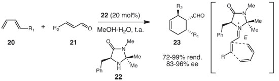Organocatálise via íon imínio O uso da organocatálise via íon imínio foi relatado pela primeira vez por MacMillan em 2000, na reaçao de Diels-Alder entre aldeídos α,β-insaturados 21 e diferentes dienos 20.17 Nesse estudo, uma série de aminas enantiopuras foram testadas como organocatalisadores, sendo a imidazolidinona 22 aquela que produziu as maiores enantiosseletividades. O controle estéreo proporcionado por 22 se dá pela presença de dois elementos: 1) formaçao seletiva do íon imínio com geometria E, evitando interaçoes do tipo 1,3-alílica entre a olefina e os substituintes metila do catalisador; 2) o bloqueio da face Re do imínio causado pela presença do substituinte benzila, deixando a face Si exposta para a reaçao com o dieno (Esquema 6).