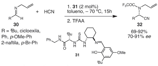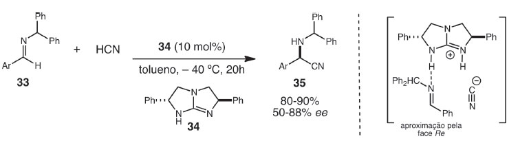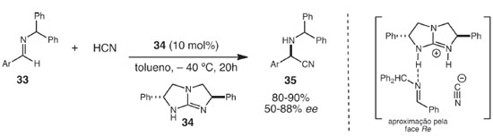 Em 1999, Corey e Grogan demonstraram que o biciclo derivado da guanidina 34 catalisa a adiçao de HCN a N-benzidriliminas 33 levando a α-aminonitrilas quirais 35 em rendimentos de 80% a 99% e 50 a 88% ee (Esquema 10).36 Neste sistema, 34 consiste num catalisador bifuncional, ativando o substrato por meio de ligaçao de hidrogênio entre a porçao guanidina e a imina e atuando concomitantemente como catalisador de transferência de fase.