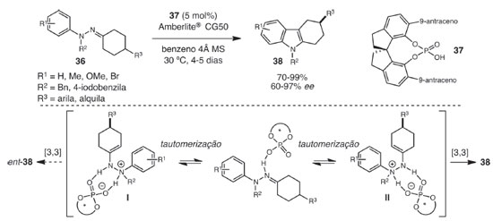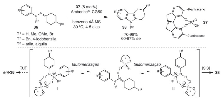 Os ácidos fosfóricos derivados de BINOL também sao amplamente utilizados como organocatalisadores em diversas reaçoes.38 Em 2011, List e colaboradores reportaram a primeira indolizaçao de Fischer enantiosseletiva promovida pelo ácido fosfórico derivado de BINOL 37 de uma série de cicloexanonas 4-substituídas derivadas de fenilidrazonas 36 levando a tetraidrocarbazóis 3-substituídos 38 em altos rendimentos e boas enantiosseletividades (Esquema 11, superior).41 Os autores propoem que o organocatalisador 37 inicialmente acelera a tautomerizaçao hidrazona-eneidrazina, levando aos intermediários quirais I e II. O intermediário II sofre entao um rearranjo sigmatrópico [3,3] irreversível numa velocidade maior que o intermediário I, formando preferencialmente o enantiômero 38 por meio de resoluçao cinética (Esquema 11, inferior).