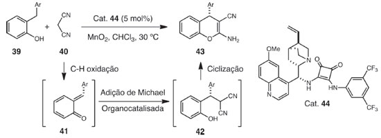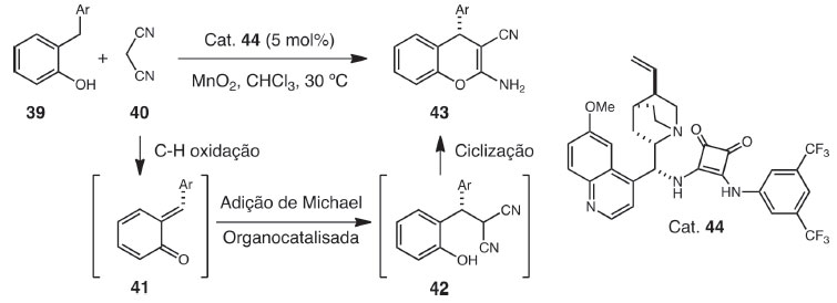 Os alcaloides cinchonas e seus derivados sao indutores quirais privilegiados e catalisam diversas classes de reaçoes orgânicas com altas enantiosseletividades. Em particular, as aminas derivadas das cinchonas vêm sendo reconhecidas como uma classe de organocatalisadores gerais, empregada em diversos modos de ativaçao.42 Em 2015, Zhou e colaboradores reportaram a síntese enantiosseletiva de 2-amino-4H-cromenos 43 a partir de fenóis substituídos 39 e malonitrila (40) por meio de uma cascata de reaçoes. Essa cascata inicia-se com a oxidaçao da ligaçao C-H benzílica na presença de MnO2, formando o intermediário 41, que em seguida sofre reaçao de Michael organocatalisada pelo catalisador 44 e ciclizaçao levando aos produtos em rendimentos de 63-97% em altas enantiosseletividades, que variaram entre 88 e 97% ee (Esquema 12).43 Na etapa organocatalisada, o hidrogênio ácido da malonitrila (40) interage com o catalisador bifuncional 44, que atua como base de Lewis, enquanto a quinona 41 é ativada por 44 por meio de ligaçao de hidrogênio, promovendo a adiçao de Michael.