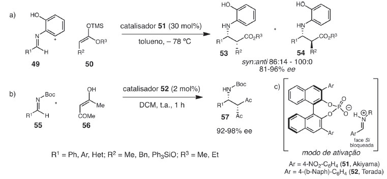 Organocatálise via contra-íon O conceito de catálise por contra-íon envolve a transferência de quiralidade por meio de interaçoes eletrostáticas no par iônico formado pela interaçao entre o catalisador iônico quiral e um substrato pró-quiral. Essa interaçao favorece a aproximaçao do nucleófilo por apenas uma das faces do intermediário eletrofílico, fornecendo preferencialmente um dos enantiômeros como produto majoritário.45 Em uma definiçao mais precisa, List denominou como "Catálise assimétrica dirigida por contra-ânion"46 e a descreveu como "refere-se à induçao enantiosseletiva em uma reaçao que procede por meio de um intermediário catiônico que forma um par iônico com um ânion quiral, enantiomericamente puro, fornecido pelo catalisador".46,47 Em 2004, Akiyama48 e Terada49 aplicaram esse conceito pela primeira vez, de forma independente, na reaçao de Mannich entre aril-iminas e silil enol éteres e enolatos, fornecendo β-aminoéteres 53 e 54 e cetonas 57, respectivamente (Esquema 14). Os grupos utilizaram como catalisador os fosfatos orgânicos derivados do BINOL 51 (Esquema 14a) e 52 (Esquema 14b) e a alta enantiosseletividade observada foi atribuída à formaçao de um par iônico entre o íon imínio intermediário e o fosfato quiral (Esquema 14c).