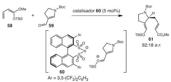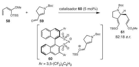 Recentemente, o conceito de catálise assimétrica dirigida por contra-ânion foi aplicado na síntese total da Estriquinina,57 um alcaloide indólico do gênero Strychnos. Uma vez que o uso de diversos ácidos de Lewis quirais havia fornecido apenas misturas racêmicas do TBS-enol éter de silício 61, o emprego da dissulfonimida 60 na adiçao de cetenoacetais de silício 58 a enais 59 forneceu o enol éter 61 de forma enantiosseletiva (Esquema 15).
