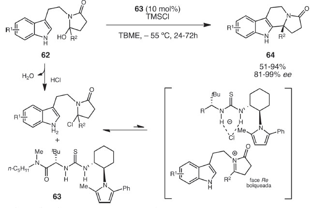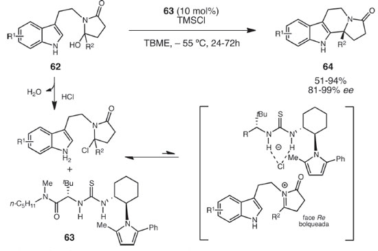 Pouco depois dos relatos seminais de Akiyama e Terada, Jacobsen demonstrou o emprego da tioureia 63 na reaçao tipo Pictet-Spengler de β-indolil etil lactamas e propôs, baseado em resultados experimentais e cálculos computacionais, que a enantiosseletividade da reaçao seria resultado da interaçao eletrostática entre o íon imínio intermediário com um complexo formado entre o catalisador e o ânion cloreto (Esquema 16).58