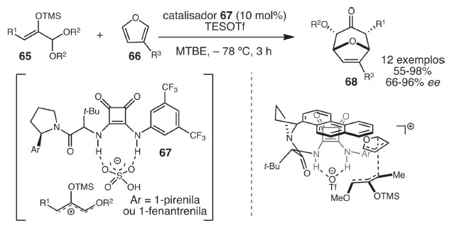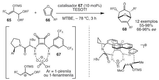 O conhecimento de que tioureias possuem habilidade de complexar-se com uma variedade de ânions59 possibilitou o emprego desse tipo de catalisador em reaçoes que apresentam intermediários catiônicos, como imínio,60,61 oxicarbênio,62 N-acilpiridinio63,64 e carbocátions.65 Outros doadores de ligaçao de hidrogênio também possuem propriedades de induçao de quiralidade através de ligaçao aniônica para gerar um par iônico quiral intermediátio, como exemplificado recentemente por Jacobsen e colaboradores (Esquema 17).66 Nesse exemplo, o catalisador 67 se complexa com sililtriflatos por meio de interaçao com o contra-ânion para formar um complexo quiral estável, capaz de realizar a cicloadiçao (4+3) entre cátions oxalílicos e derivados do furano. Essa estratégia permite acesso a carbociclos de 7 membros de forma enantiosseletiva, cujo sucesso era limitado até entao. Os autores propoem, baseados em cálculos teóricos, que o principal fator responsável pela enantiosseletividade seria uma interaçao do furano com a porçao aromática do complexo quiral, o que promove uma estabilizaçao do estado de transiçao.