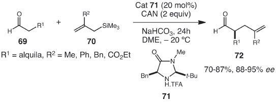 Organocatálise via SOMO Em 2007, MacMillan e colaboradores apresentaram um novo modo de ativaçao de organocatalisadores, adicionando um oxidante a enaminas formadas in situ a partir da imidazolidinona 71 e aldeídos 69, promovendo reaçoes enantiosseletivas de α-alilaçao na presença de aliltrimetilsilano 70 em excelentes rendimentos e enantiosseletividades (Esquema 18).67