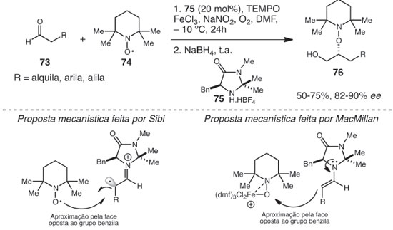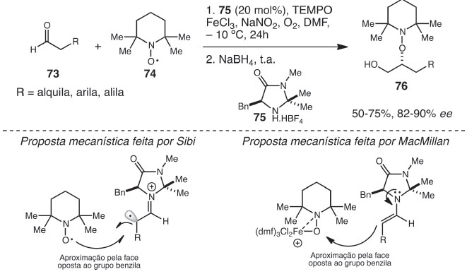 Simultaneamente à publicaçao da reaçao de α-alilaçao de MacMillan e colaboradores em 2007, Sibi e Hasegawa reportaram reaçoes de α-oxiaminaçao de aldeídos 73 na presença de TEMPO (74) e quantidades catalíticas da imidazolidinona 75, FeCl3 e NaNO2, em rendimentos moderados a bons e altas enantiosseletividades (Esquema 19, superior).70 Neste artigo, os autores propuseram que a reaçao ocorre através de um mecanismo com ativaçao via SOMO, com a formaçao do cátion radicalar a partir da oxidaçao da enamina formada com a reaçao entre o aldeído 73 e o catalisador 75, seguido da reaçao deste cátion com o TEMPO. Entretanto, em 2010, MacMillan e colaboradores demonstraram através de estudos cinéticos, espectrométricos e espectrofotométricos que esta reaçao prossegue com ativaçao por enamina tradicional (Esquema 19, inferior).71