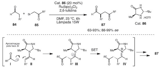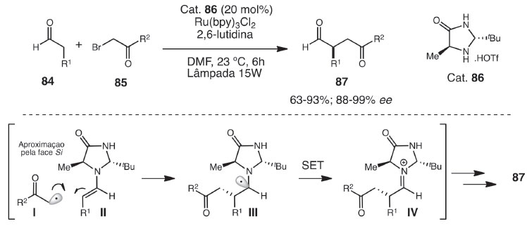Apesar do valor intrínseco desse modo de ativaçao, cerca de 2 a 2,5 equivalentes de oxidante sao requeridos nas reaçoes, o que representa uma grande desvantagem em termos de economia de átomos e produçao de resíduos. Para resolver essa limitaçao, reaçoes utilizando os catalisadores fotorredox passaram a ser investigadas, dando origem a um novo modo de ativaçao. Organocatálise via fotorredox A fotocatálise refere-se ao uso de energia luminosa para aceleraçao de reaçoes químicas através de uma espécie reativa formada no contato com a luz. Mais precisamente, um fotocatalisador ativado pela absorçao de luz é capaz de induzir um substrato, um reagente ou um catalisador secundário a participar de reaçoes radicalares, habilitando reatividades que seriam impossíveis pelo mecanismo iônico tradicional.78-82 Em 2008, um artigo de MacMillan e Nicewicz foi pioneiro ao trazer a fotocatálise para o universo crescente da organocatálise, através da combinaçao de ativaçao via enamina e catalisadores fotorredox, para geraçao de espécies radicalares a partir de brometos. O mecanismo proposto envolve a aproximaçao do radical eletrofílico I, gerado a partir da reduçao do brometo 85 pelo catalisador de rutênio , pela face Si do carbono da enamina II. O radical nucleofílico resultante é entao oxidado para formar o imínio IV, posteriormente hidrolisado para levar aos produtos com excelentes enantiosseletividades (Esquema 22, inferior). Com isso, foi possível realizar a α-alquilaçao enantiosseletiva de diversos aldeídos a partir de compostos α-bromo-carbonílicos (Esquema 22).83