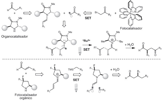 A combinaçao entre a organocatálise enantiosseletiva e a fotocatálise vem se dando a partir de duas estratégias principais: empregando dois catalisadores em conjunto ou empregando um único catalisador. Na primeira abordagem, um catalisador fotorredox metálico ou orgânico combina-se sinergicamente com um organocatalisador quiral em seus diferentes modos de ativaçao genéricos, ativando substratos orgânicos a partir da remoçao ou doaçao de elétrons (Esquema 23, parte superior). Na segunda abordagem, a capacidade de organocatalisadores quirais atingirem um estado excitado após a absorçao de luz é explorada, promovendo a ativaçao de substratos orgânicos em reaçoes assimétricas a partir da geraçao de espécies radicalares sem a necessidade de um outro catalisador (Esquema 23, parte inferior).84 Esses processos de oxidaçao ou reduçao, e consequente transformaçao dos substratos orgânicos em espécies radicalares, podem ocorrer através de etapas de SET (do inglês, "Single Eletron Transfer") ou HAT (do inglês, "Hydrogen Atom Transfer") ou seja, por etapas de transferência de um elétron ou de transferência radicalar de hidrogênio.85,86