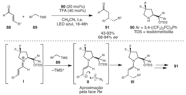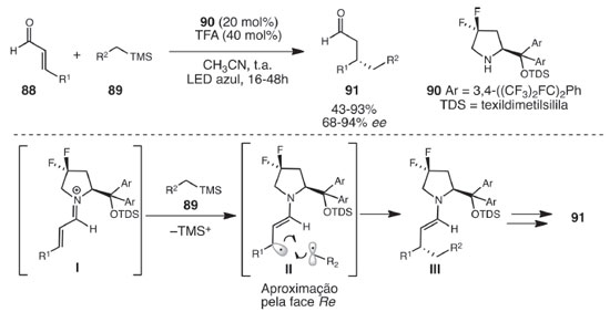 O grupo de Melchiorre, que vem publicando excelentes trabalhos com reaçoes fotocatalisadas sem uso de catalisadores metálicos, apresentou recentemente a β-alquilaçao de aldeídos α,β-insaturados 88 utilizando silanos 89, promovida pelo organofotocatalisador derivado de prolina 90, obtendo aldeídos β-alquil-arílicos 91 com excelentes rendimentos e enantiosseletividades (Esquema 24).87
