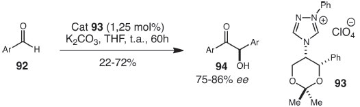 ![]() Esquema 25. Condensaçao de benzoína enantiosseletiva reportada por Enders et al.
