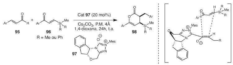 Huang e colaboradores reportaram a síntese enantiosseletiva de organosilanos, contendo dois centros estereogênicos contíguos, a partir de reaçoes de cicloadiçao de Diels-Alder organocatalisadas por NHCs triazólicos entre enolatos, formados a partir da reaçao entre 95 e o carbeno derivado de 97, e β-sililenonas com excelentes diastereo- e enantiosseletividades, usando condiçoes brandas e com amplo escopo do substrato (Esquema 27).105
