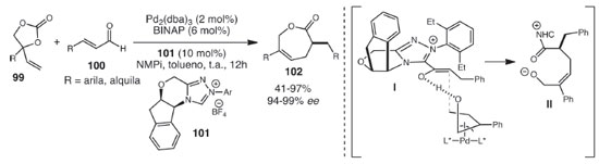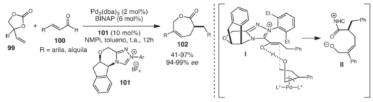 Recentemente, Glorius e colaboradores apresentaram reaçoes enantiosseletivas de anelaçoes [5 + 2] de viniletileno e aldeídos insaturados, através de um sistema catalítico de cooperaçao entre NHC e paládio, levando a lactonas insaturadas de 7 membros com altas enantiosseletividades. Nessa reaçao, o intermediário π-alil-paládio, formado a partir da descarboxilaçao de 99, sofre um ataque nucleofílico do enol, formado a partir do intermediário de Breslow derivado de 100, seguido pela ciclizaçao enantiosseletiva e regeneraçao do NHC e do catalisador de paládio (Esquema 28).106 No modelo proposto no Esquema 28, pode-se observar que a face Si d o enol Z está bloqueada pelos substituintes do NHC, enquanto a face inferior do intermediário π-alil-paládio está blindada pelos ligantes do paládio, explicando as altas enantiosseletividades da reaçao.