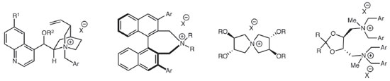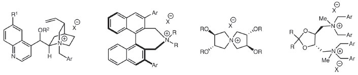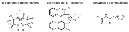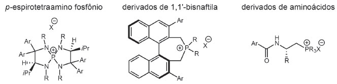 O uso de sais de fosfônio como catalisadores quirais de transferência de fase foi relatado pela primeira vez por Shioiri e colaboradores em 1997 na reaçao aldólica assimétrica entre éteres enólicos de silício e aldeídos.116 Pouco se avançou nesse campo na década que se seguiu, porém, diversos estudos de design de novos catalisadores e suas aplicaçoes foram publicados nos últimos dez anos.86 Essa classe de catalisadores é subdividida em três subclasses, dependendo da sua estrutura básica: os sais de p-espirotetraamino fosfônio, os derivados de 1,1'-bisnaftila e os derivados de aminoácidos (Figura 11). Diversos tipos de transformaçoes já foram realizados com sucesso empregando essas classes de sais de fosfônio, dentre eles: aminaçoes, adiçoes conjugadas, reaçoes de Mannich, fluoraçao, reaçao de Aza-Henry e dessimetrizaçoes.117