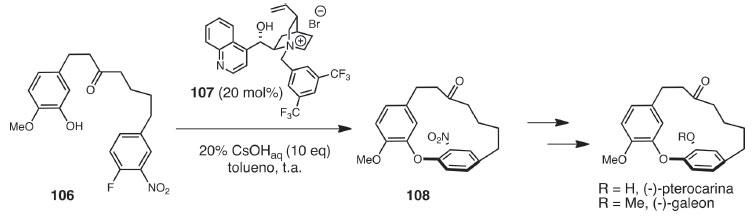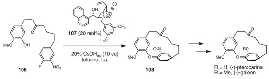 Recentemente, Cai e colaboradores relataram a síntese assimétrica de atropoisômeros nao-bisarílicos 108 por meio de substituiçao nucleofílica aromática intramolecular do precursor 106 na presença do sal de cinchônio 107 (Esquema 30).118 Dois integrantes da classe dos diariléter heptanóides, (-)-Pterocarina e (-)-Galeon, foram sintetizados, demonstrando a importância da catálise por transferência de fase na síntese de produtos naturais.