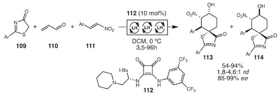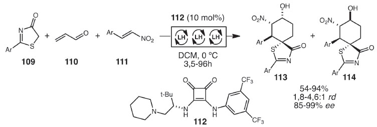 ORGANOCASCATAS Por meio de estratégias de síntese orgânica tradicionais, produtos com altíssima complexidade vêm sendo obtidos a custo de diversas etapas, na chamada estratégia "stop and go", que acaba implicando em perdas de eficiência e aumento de custos nas etapas intermediárias de isolamento e purificaçao. Uma síntese de muitas etapas torna-se, dessa forma, desfavorável para escalonamento industrial, por exemplo. Utilizar reaçoes em cascata119 é uma estratégia sintética, que visa poupar etapas de isolamento e purificaçao ao projetar diversas reaçoes que ocorram em etapas sequenciais dentro de um único ambiente reacional ("one-pot"). Essas reaçoes podem se processar com dois ou mais componentes (multicomponente) ou de forma sequencial.120 Essa estratégia é inspirada em processos biossintéticos que, via de regra, nao possuem etapas de isolamento e purificaçao. Para isso, os mecanismos biológicos apoiam-se na especificidade e seletividade das enzimas, que levam os substratos simples a produtos complexos com altíssima eficiência e estereoseletividade. Com o advento da organocatálise e seus modos de ativaçao genéricos, diversas organocascatas, reaçoes em cascata cujas etapas sao organocatalisadas, foram pensadas baseando-se na ortogonalidade dos modos de ativaçao dos diversos substratos presentes.121,122 Uma revisao minuciosa sobre o desenvolvimento das organocascatas está fora do escopo desta publicaçao, dada a complexidade do assunto, o grande número de trabalhos publicados e a diversidade das estratégias sintéticas empregadas, mas diversas revisoes recentes dedicadas exclusivamente a este tema podem ser encontradas, desde as mais genéricas120-124 até as mais específicas125-127 sobre algum tipo particular de cascata. Uma recente publicaçao na área mostra a síntese enantiosseletiva de espiro-tiazol-4-onas 113 e 114 através de uma reaçao multicomponente, cujo mecanismo proposto pelos autores passa por três etapas em cascata (adiçao de Michael - adiçao de Michael - adiçao de Henry), organocatalisadas pelo derivado de esquaramida 112, promovendo sequenciais ativaçoes por ligaçao de hidrogênio.128 Os autores reportam tiazolonas ariladas com boa variabilidade estrutural, com rendimentos de 54% a 94% (apenas dois casos isolados obtiveram misturas complexas, com rendimentos de 28% para apenas um dos diastereoisômeros esperado), razoes diastereoisoméricas de 1,8:1 até 4,6:1 e excessos enantioméricos excelentes, a maioria entre 93-99% (Esquema 31).