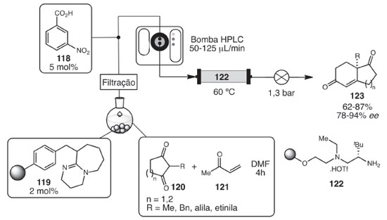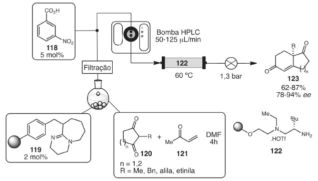O grupo de Pericàs e colaboradores reportou a síntese de uma diamina vicinal ancorada em poliestireno 122 capaz de catalisar a reaçao de anelaçao de Robinson enantiosseletiva para síntese de uma série de cetonas bicíclicas similares às de Hajos-Parrish e Wieland-Miescher, estruturas importantes na síntese de sesquiterpenoides, diterpenoides e esteroides. Em condiçoes otimizadas, a ciclizaçao foi realizada com rendimentos de 62-87% e excessos enantioméricos de 78-94%, após a prévia formaçao do aduto de Michael a partir da mistura dos reagentes a uma resina comercial contendo DBU (Esquema 33).132