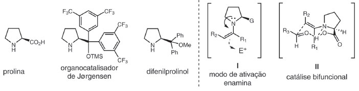 Desde entao, inúmeros trabalhos foram publicados utilizando a ativaçao por meio de enamina, nao só em reaçoes aldólicas, mas também em reaçoes de Mannich, reaçoes de Michael, reaçoes de substituiçao à carbonila, alfa-alquilaçoes, reaçoes de Aza Michael, dentre outras.11 Os principais organocatalisadores empregados nesses trabalhos sao aminas secundárias quirais, com destaque à prolina e aos seus derivados (Figura 1). A ativaçao se dá pela reaçao entre o organocatalisador e um composto carbonílico, aldeído ou cetona, e a consequente formaçao de um intermediário enamina, que é um excelente nucleófilo e pode participar de diversas reaçoes com diferentes eletrófilos (intermediário I, Figura 1). Por ativar o nucleófilo e, consequentemente, aumentar a energia do orbital molecular ocupado de mais alta energia, essa ativaçao também é conhecida como ativaçao HOMO (do inglês, "Highest Occupied Molecular Orbital"). Ainda neste contexto, a prolina, especificamente, pode atuar como um organocatalisador bifuncional, fazendo a ativaçao via enamina do nucleófilo da reaçao e ao mesmo tempo promovendo a ativaçao do eletrófilo da reaçao por meio de ligaçao de hidrogênio (intermediário II, Figura 1).