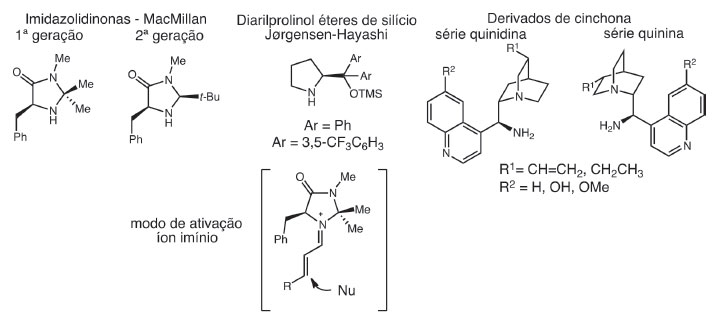 A catálise via íon imínio se baseia na capacidade que aminas quirais apresentam de reagir, de forma reversível, com compostos carbonílicos α,β-insaturados, produzindo íons imínio e, consequentemente, reduzindo a energia do orbital molecular desocupado de mais baixa energia (LUMO - do inglês, "Lowest Unoccupied Molecular Orbital").18 Dentre as características principais para que um organocatalisador seja utilizado neste modo de ativaçao estao a eficiência de formaçao reversível e o alto grau de controle da geometria do íon imínio formado, bem como da face da olefina que estará disponível para aproximaçao. Somado a isso, a facilidade de preparaçao e implementaçao da amina sao cruciais.18 As principais famílias de compostos usados para esse modo de ativaçao estao apresentadas na Figura 2.