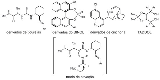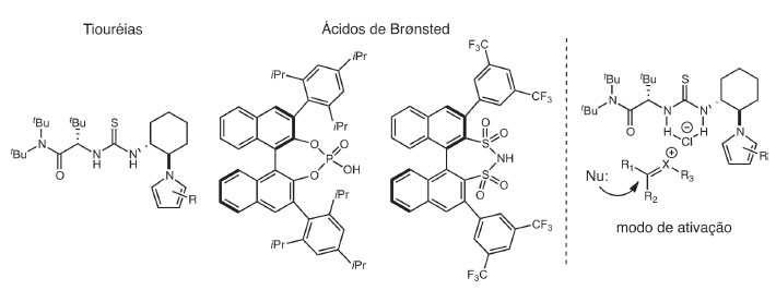 As principais classes de catalisadores empregadas em catálise por contra-íon sao os ácidos de Bronsted quirais e as tioureias (Figura 4). A facilidade de síntese, a variaçao estrutural e a generalidade desses catalisadores estao dentre as vantagens que possibilitaram seu emprego em diversos tipos de transformaçoes assimétricas, como a reduçao conjugada de aldeídos50 e cetonas,51 a epoxidaçao de aldeídos α,β-insaturados,52 a abertura de meso-aziridínios, -epissulfônios53 e -halônios,54 a reaçao aldólica de Mukaiyama55 e em substituiçoes alílicas.56