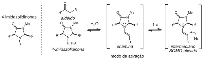 Este modo de ativaçao foi chamado de SOMO em alusao às ativaçoes via enamina e via íon imínio, também conhecidas como ativaçoes HOMO e LUMO, respectivamente. Uma vez que a enamina é formada, ela sofre um processo de transferência de um elétron para o oxidante, formando um cátion radicalar intermediário contendo três elétrons π, com um orbital molecular ocupado por um elétron, ou seja, um orbital SOMO (do inglês, "Singly Occupied Molecular Orbital").68,69 Este intermediário pode entao sofrer reaçoes radicalares com uma série de nucleófilos ricos em elétrons π, possibilitando diferentes transformaçoes. Os principais organocatalisadores utilizados neste modo de ativaçao sao as 4-imidazolidinonas, que fornecem altos níveis de enantiocontrole, em combinaçao comumente com oxidantes de cério (IV) (Ce(NH4)(NO3)6), ferro (III) ([Fe(phen)3](PF6)3) ou cobre (II) (Cu(ClO4)2, Cu(TFA)2) (Figura 5).