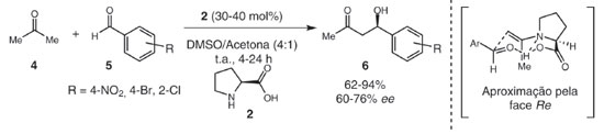 Os autores propuseram um mecanismo para a açao da prolina envolvendo um intermediário enamina, mas foi apenas em 2000 que List e colaboradores nao só propuseram um mecanismo mais acertado para a reaçao, mas também demonstraram que a prolina poderia ser aplicada como catalisador em diversas reaçoes aldólicas intermoleculares entre acetona (4) e diversos aldeídos aromáticos (5), estabelecendo um modo de ativaçao genérico envolvendo enaminas intermediárias como nucleófilos. A seletividade pode ser explicada a partir de um estado de transiçao similar ao de Zimmerman-Traxler, onde uma ligaçao de hidrogênio tricíclica, que provê uma certa rigidez ao sistema, gera a seletividade facial para a aproximaçao do nucleófilo, que se dá pela face Re da carbonila (Esquema 2).10