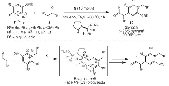 Apesar de ser um dos modos de ativaçao mais clássicos, a catálise via enamina ainda se mostra uma ferramenta robusta, versátil, e com muito potencial de exploraçao e inovaçao. Recentemente, Bertuzzi e colaboradores reportaram a desaromatizaçao enantiosseletiva de sais de piridina com elevada regiosseletividade para a adiçao em C-4, através de catálise por enamina usando o catalisador 9, gerando 1,4-diidropiridinas 10 (Esquema 3, superior). A induçao da seletividade, proposta pelos autores, ocorre por meio de um estado de transiçao acíclico sinclinal, no qual há interaçao eletrostática do grupo nitro da piridina com o par de elétrons da enamina. Conjuntamente, o grupo difenilsiloximetila estabiliza a enamina em sua conformaçao anti e bloqueia a face Re do seu carbono nucleofílico C3, definindo a aproximaçao com o carbono C4' da piridina e consequentemente a seletividade observada. (Esquema 3, inferior).12 A presença de um grupo retirador de elétrons (GRE) na posiçao 3 do anel mostrou-se fundamental e, quando o grupo nitro é utilizado, geram-se precursores de 4-alquil-3-aminopiperidinas, esqueletos importantes na síntese de alcaloides e outras substâncias de elevado valor medicinal. Neste artigo, por exemplo, é reportada a síntese de uma estrutura central em peptídeos miméticos com açao anticancerígena.
