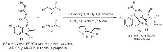 Em 2010, Jiang e colaboradores reportaram a reaçao dominó Michael-Michael-Michael-Aldol tricomponente, contendo quatro etapas organocatalisadas por meio de ativaçao via imínio-enamina-imínio-enamina, através da qual 11 reage com os aldeídos α,β-insaturados 12 e 13 na presença de ácido benzóico e do organocatalisador 9, gerando, através de uma reaçao one-pot, diversos derivados de hidroindanos 14 com um complexo esqueleto policíclico contendo até seis centros estereogênicos contíguos e um esqueleto de espirooxindol (Esquema 4).13 Em 2017, Ren e colaboradores publicaram uma reaçao similar envolvendo também uma reaçao dominó de quatro etapas oxa-Michael-Michael-Michael-Aldol organocatalisadas via imínio-enamina-imínio-enamina pelo mesmo derivado de prolina, gerando oxindolas carbocíclicas fundidas por um estrutura do tipo espiro.14