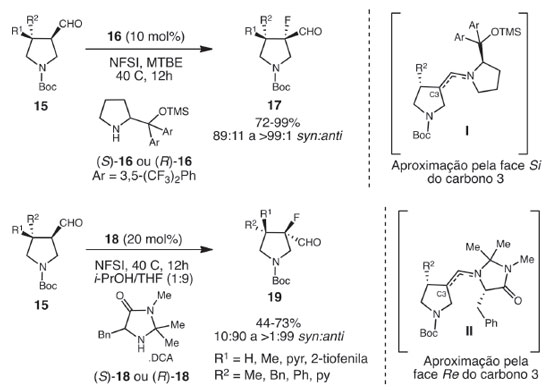 Em 2016, Fjelbye e colaboradores reportaram uma síntese diastereodivergente de β-fluoro-β-prolinais 17 e 19, contendo dois centros estereogênicos adjacentes.15 O controle da diastereosseletividade foi dado pela escolha entre dois organocatalisadores distintos, sendo o derivado de prolina 16 o organocatalisador de escolha para a fluoraçao syn; e a imidazolidinona 18 a escolha para a fluoraçao anti, melhorando a seletividade natural dada pelo substrato de prolinal. Após a formaçao da enamina, preferencialmente na configuraçao Z, a fluorinaçao ocorre através da aproximaçao da fonte de flúor com o carbono C3 da enamina pela face que nao é impedida pelo grupo lateral da prolina ou imidazolidinona, levando aos produtos com as seletividades reportadas (Esquema 5). Em 2017, o mesmo grupo publicou o uso deste sistema para síntese de β-fluoro-β-prolinais com estruturas espirocíclicas.16
