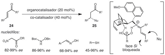 Os primeiros organocatalisadores utilizados foram as imidazolidinonas, desenvolvidas por MacMillan no início dos anos 2000.17,19 A imidazolidinona de primeira geraçao mostrou-se eficiente na catálise enantiosseletiva em reaçoes de Diels-Alder,17 cicloadiçao 1,3-dipolar20 e alquilaçao de Friedel-Crafts empregando nucleófilos ricos em elétrons.21 Porém, alguns compostos heteroaromáticos, como indol e furano, apresentaram menor reatividade frente a essas reaçoes de alquilaçao organocatalisadas. Visando solucionar essa limitaçao, MacMillan desenvolveu a imidazolidinona de segunda geraçao (Figura 2).19 O novo organocatalisador foi desenhado de forma a aumentar a eficiência tanto da formaçao do íon imínio intermediário, visto que o par de elétrons do nitrogênio está posicionado afastado dos grupos substituintes, tornando-o menos impedido para reaçao com a carbonila, quanto da formaçao da nova ligaçao carbono-carbono, visto que a ausência de um dos substituintes no carbono vizinho ao nitrogênio torna a face do imínio que está disponível para a aproximaçao menos impedida. Outra classe de organocatalisadores, introduzida em 2005 por Jorgensen,22 sao os diarilprolinol éteres de silício (Figura 2).23 Além da ativaçao de aldeídos α,β-insaturados para funcionalizaçao 1,4-, essa classe de organocatalisadores possibilitou a extensao da reatividade das adiçoes conjugadas para adiçoes 1,6. O emprego de 2,4-dienais levou à formaçao de íons imínio vinílogos apresentando três sítios eletrofílicos distintos.24 Inúmeros trabalhos vêm sendo publicados utilizando a ativaçao através de íon imínio, nao só em reaçoes de Diels-Alder, como também em reaçoes de substituiçao eletrofílica de Friedel-Crafts, reaçoes de Michael, de aminaçao, de oxigenaçao, de epoxidaçao, ciclopropanaçao, entre outras.18 Em 2007, Chen25,26 e Melchiorre27 demonstraram, independentemente, o uso das aminas primárias derivadas de alcaloides cinchona na ativaçao por íon imínio. Essas aminas primárias foram utilizadas em reaçoes de adiçao conjugada em cetonas α,β-insaturadas 24 com diferentes nucleófilos de forma altamente enantiosseletiva (Esquema 7).28-31 O controle da enantiosseletividade se dá por meio da ativaçao da enona pela amina primária presente no catalisador quiral, enquanto interaçoes como ligaçao de hidrogênio ou eletrostáticas aproximam o nucleófilo da enona ativada. Esses catalisadores sao particularmente eficientes na funcionalizaçao de compostos estericamente impedidos, como cetonas e aldeídos substituídos na posiçao α-carbonila.32
