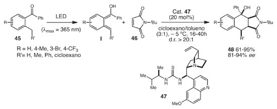 Em 2016, Melchiore e colaboradores reportaram a reaçao enantiosseletiva de fotoenolizaçao/Diels-Alder organocatalisada entre benzofenonas substituídas 45 e maleimidas 46, utilizando a tioureia derivada de cinchona 47 como organocatalisador, levando a cicloadutos em rendimentos de 61 a 95% e enantiosseletividades de 81 a 94% ee (Esquema 13). No processo catalítico a tioureia quiral ativa a maleimida, por meio de interaçoes nao covalentes, que intercepta o enol intermediário I estereosseletivamente. Além disso, a porçao quinuclidina do catalisador 47 inibe reaçoes secundárias racêmicas, através da reduçao do enol disponível no meio.44